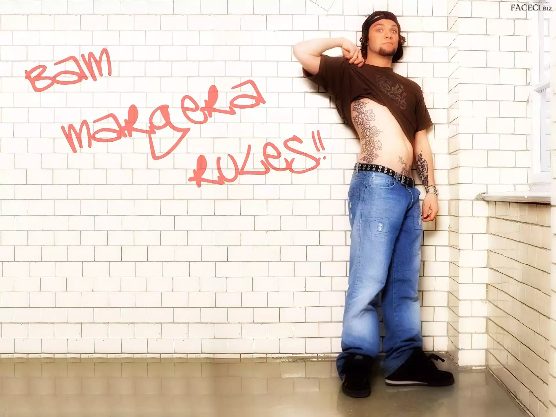 kurtka, Bam Margera, rozpięta okulary, Bam Margera, butelka okulary, Bam Margera, twarze t-shirt, Bam Margera, brązowy włosy, Bam Margera, ciemne zegarek, Bam Margera, deskorolka